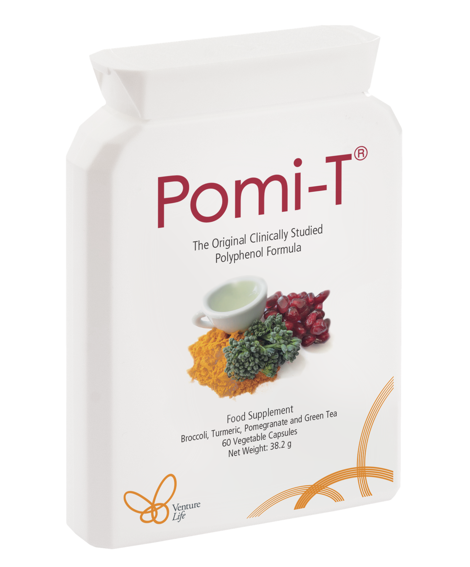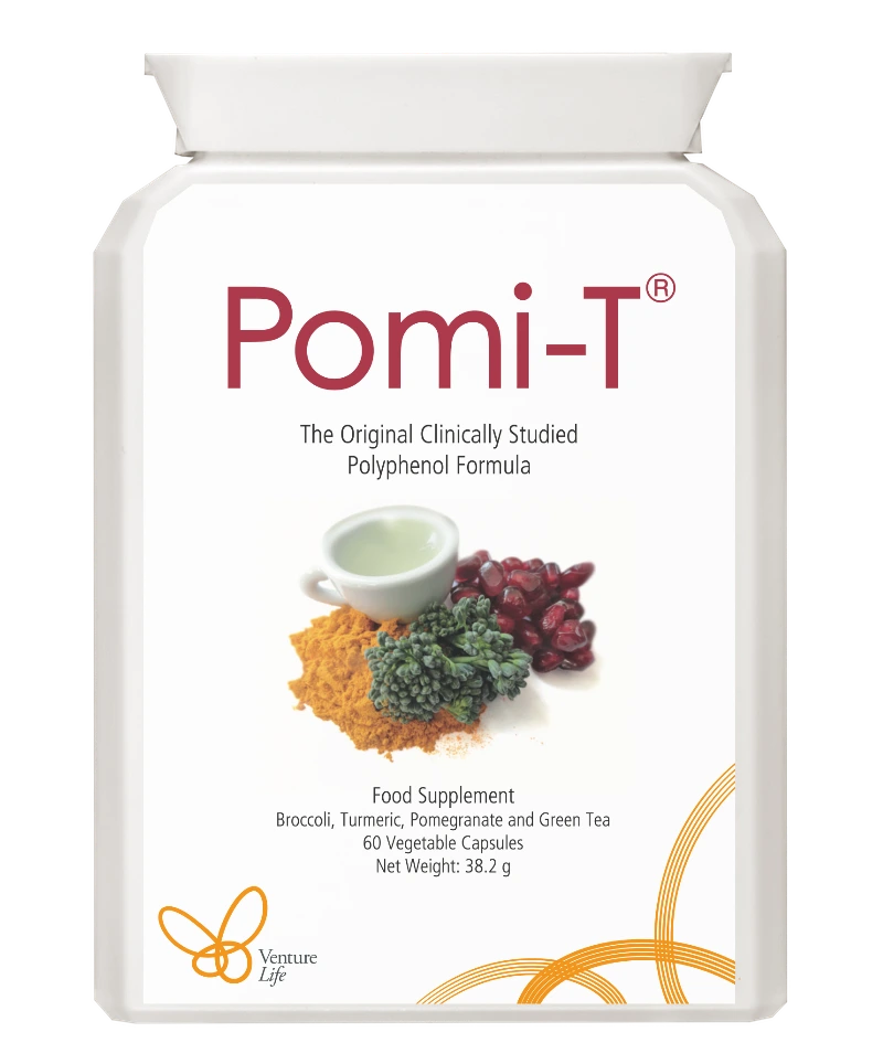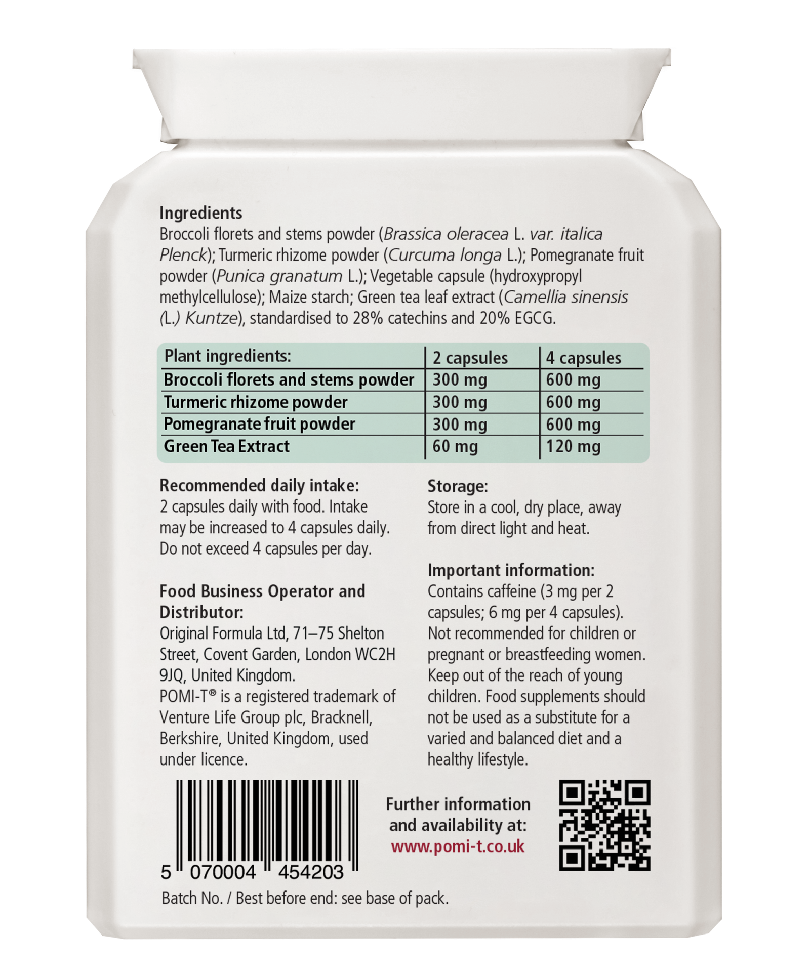 Pomi-T® combines broccoli, turmeric, green tea and pomegranate in its original multi-polyphenol formulation, delivering a consistent blend of naturally occurring polyphenols in one convenient daily capsule.